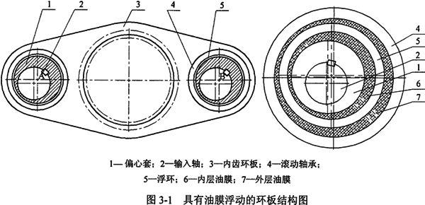 選擇不同的均載構(gòu)件,其等效中心誤差是不同的,本章選擇如圖3-1所示的在三環(huán)減速機(jī)的轉(zhuǎn)臂偏心軸套與轉(zhuǎn)臂軸承之間插入一轉(zhuǎn)動(dòng)套筒,在偏心軸和套筒之間以及套筒與軸承內(nèi)表面之間形成動(dòng)壓油膜的油膜浮動(dòng)均載方案。