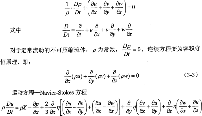 式中u,v,w——分別為沿坐標(biāo)x, y,z方向的流速;X,Y,Z——體積力分量;p——密度;η——粘度;t——時(shí)間。