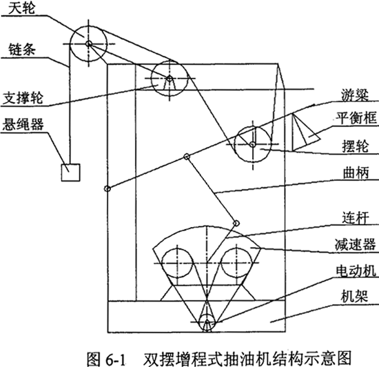 雙擺增程式抽油機(jī)的結(jié)構(gòu)如圖6-1所示。其工作原理為:電機(jī)的高速旋轉(zhuǎn)運(yùn)動(dòng),通過兩級(jí)三環(huán)減速器、四連桿機(jī)構(gòu)轉(zhuǎn)變成游梁的往復(fù)擺動(dòng),游梁上的擺輪隨游梁一起擺動(dòng),再通過鏈條纏繞滑輪組傳動(dòng)并帶動(dòng)光桿上下運(yùn)動(dòng),實(shí)現(xiàn)抽油過程。該機(jī)是利用鏈條行程是擺輪行程兩倍的原理,實(shí)現(xiàn)增程的。
