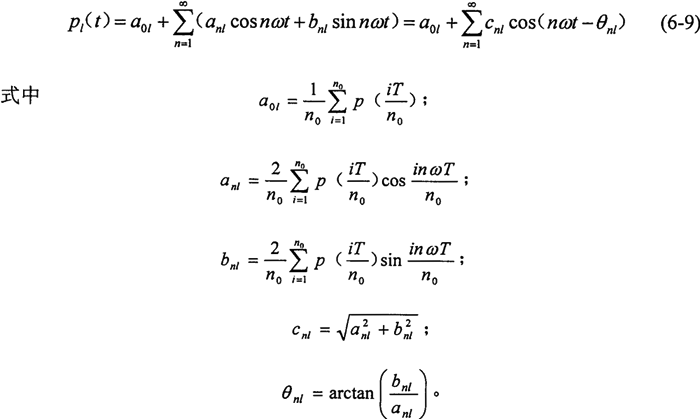 方程右端的激勵(lì)精圖治振力是復(fù)雜周期函數(shù),依據(jù)傅里葉級(jí)數(shù)展開原量,可將非簡諧的周期性激振力展成多個(gè)頻率成整倍數(shù)關(guān)系的簡諧激振力函數(shù)之和。由前面分析知,連桿力分力、慣性力和曲柄軸扭矩均為曲柄轉(zhuǎn)角的函數(shù),由于曲柄軸轉(zhuǎn)速恒定,故,激振力為時(shí)間的函數(shù),設(shè)為Pl(t),(l=1,2,3,4)其周期為T,考慮到激振力函數(shù)復(fù)雜且連桿力中的懸點(diǎn)載荷W難以用數(shù)學(xué)表達(dá)式描述,積分難以實(shí)現(xiàn),采用求和的方法求系數(shù)更為有效,以n0作為一個(gè)周期的等分區(qū)間數(shù)(一般取n0=36),時(shí)間區(qū)間為△t=T/n0,則它的傅里葉級(jí)數(shù)為: