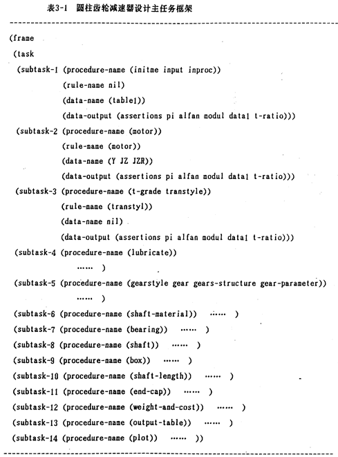 規(guī)格化的框架表達形式在圓柱齒輪減速器設(shè)計中應(yīng)用非常廣泛,如圓柱齒輪減速器中主任務(wù)框架(表3-1 ),齒輪強度校核中使用的各類系數(shù)框架(表3-2)等均具有知識的規(guī)格化框架表達形式。