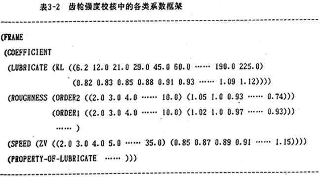 (2)圖表知識的數(shù)據(jù)化:圖表知識的數(shù)據(jù)化過程是首先將圖表進行離散處理,然后,再對離散數(shù)據(jù)按數(shù)表型知識進行處理。表3-2是齒輪強度校核中的各類圖表系數(shù)數(shù)據(jù)化后用框架形式表達的知識。其中,有潤滑劑(lubricator)系數(shù)KL,粗糙度(roughness)系數(shù)orderl (淬火齒面)、order2(調(diào)質(zhì)齒面),……。