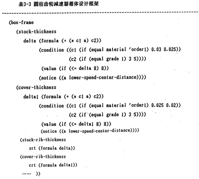 圓柱齒輪減速器專家系統(tǒng)設(shè)計中,變體框架知識元應(yīng)用的非常廣泛,表3-3是圓柱齒輪減速器箱體結(jié)構(gòu)參數(shù)設(shè)計時采用的框架。表3-3是表3-4所表示的知識的再現(xiàn)。