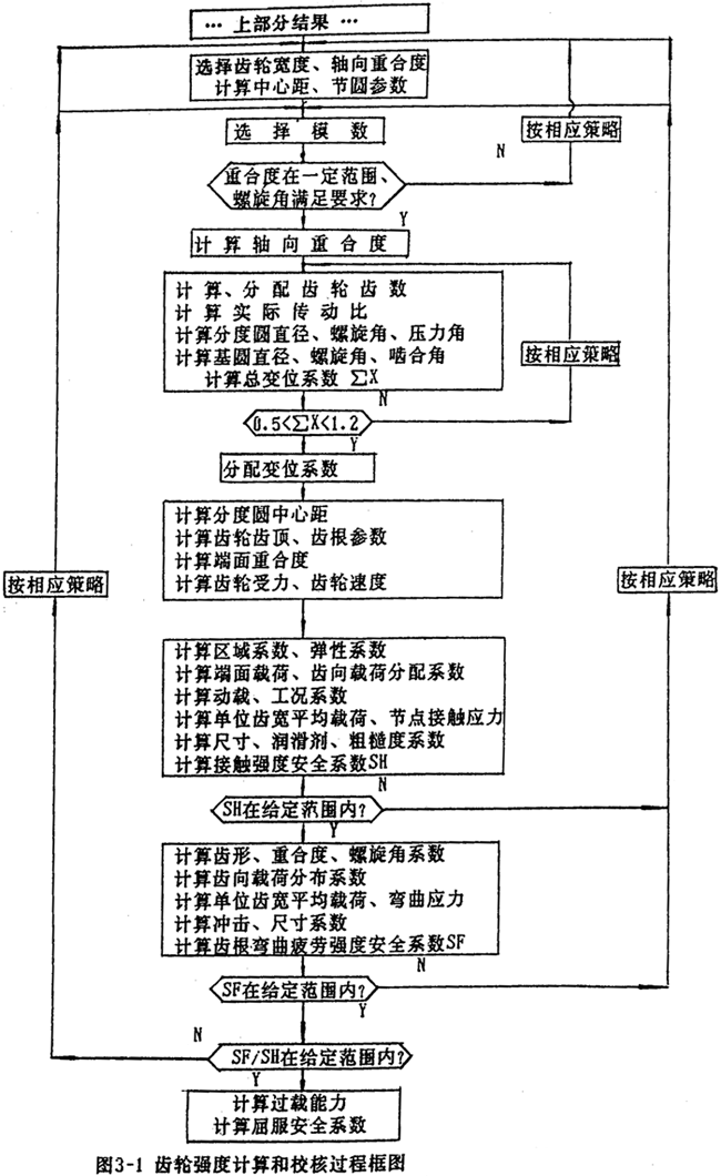 以上所討論的知識表達的各種方式均是建立在一定格式的基礎(chǔ)上的,可以說是知識的描述性(declarative)表達方式。這類知識的表示一般具有模塊性,自然性,清晰性等。但正是由于格式的限制,因此對于某些功能,如回溯、反復(fù)的校核計算等這樣一類操作,不如用語言編寫知識過程來得方便。用語言形式直接編寫知識過程,便有了圓柱齒輪減速器設(shè)計知識的過程表示?驁D3-l是齒輪強度計算、校核的過程框圖,這樣一個過程需要多次重復(fù)的計算。使用過程表示可使求解過程按照嵌入的程序次序進行調(diào)用,它們不需要和選擇那些不相關(guān)的知識,也不需要那些不自然的推理路徑。同時,還能夠把領(lǐng)域特有的,導(dǎo)致更為直接推理過程的啟發(fā)性知識結(jié)合到設(shè)計過程中去,因而能夠大幅度地提高運行效率。