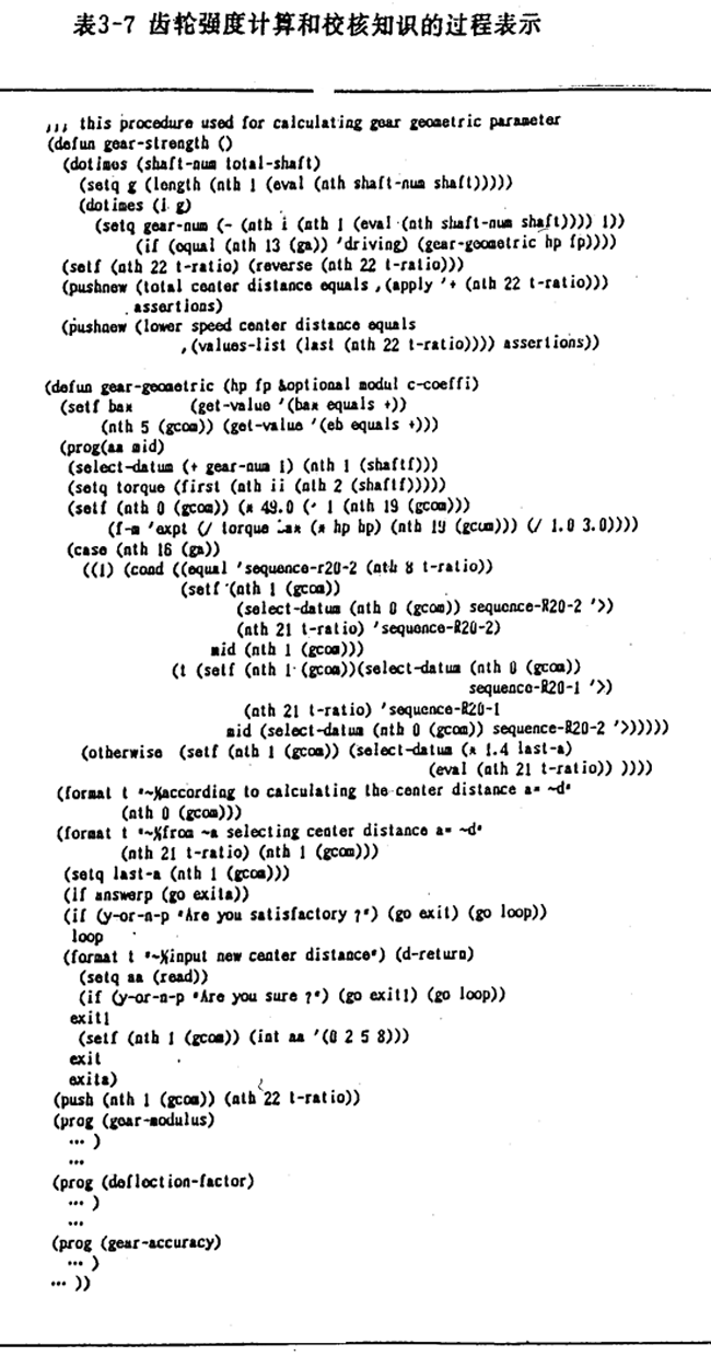 在LlSP語言中,過程表示用函數(shù)表達,表3-5是圖3-l所示的齒輪強度計算和校核知識的過程表示的形式。