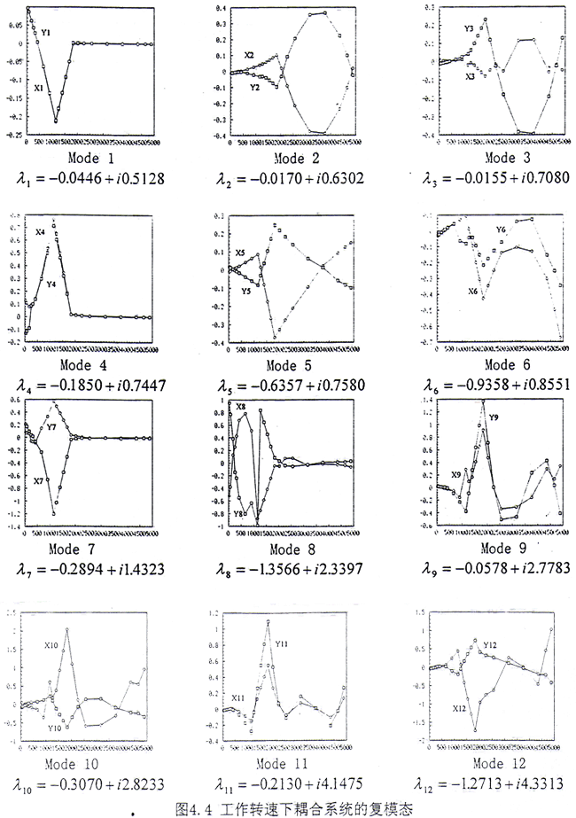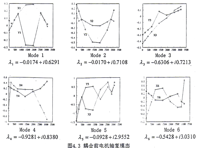 通過齒輪聯(lián)軸器耦合后的轉子系統(tǒng),在上述給定的轉速范圍內,共為12階模態(tài),如圖4.4所示,比耦合前多了2階。這表明耦合后在上述轉速范圍內模態(tài)數(shù)目發(fā)生了變化。耦合系統(tǒng)的模態(tài)可以分為兩類:(1)第一類為耦合成分很小的振動,例如Mode1、Mode4、Mode7、Mode8,這4階幾乎完全表現(xiàn)為G軸的振動,電機軸的振動很小。但是從模態(tài)圖上來看又不能與耦合前單個G軸的4階模態(tài)相對應,主要表現(xiàn)為與齒輪聯(lián)軸器相連接的G軸的外伸端在耦合前上述4階的振動很大,而在耦合后振動受到很大的抑制,振動很小。從復特征值來看,無論是反應系統(tǒng)衰減快慢的實部,還是反映系統(tǒng)自然振動頻率的虛部都有不小的變化。如果將上述4階對應的復特征值作一比較,那么其中耦合后的虛部值總是大于耦合前的對應值。其主要原因是在耦合后將G軸和電機軸作為一個整體系統(tǒng)來考慮,此時相當于將電機軸看作是對G的一個約束,這一約束直接作用于外伸端,使得G軸外伸端的振動減小,同時使得G軸的自然頻率增大。因此傳統(tǒng)上在計算DH機組的動態(tài)特性時,強行將G軸和電機軸分開,而只考慮其中的G軸,僅從這4階模態(tài)和復特征值上進行分析也會產生較大的偏差。(2)第二類為G軸和電機軸之間的耦合模態(tài),在這8階模態(tài)中G軸和電機軸的振動非常明顯,這表明如果將G軸和電機軸在齒輪聯(lián)軸器處分開處理,僅計算G軸的振動,而不考慮電機軸的影響,那么上述8階模態(tài)會全部被漏掉,因此這樣處理會丟失一些非常重要的低頻信息。在文獻[18]中,由于未考慮電機軸的作用,因此與電機軸有關的模態(tài)信息就不出現(xiàn)。如果從這8階復特征值前6階的數(shù)值來看,那么都能從耦合前電機軸的6階模態(tài)中找到,而且低階特征值的實部和虛部變化均不大。這說明如果僅分析電機軸的振動,那么將G軸忽略掉,倒能得到較好的近似。從直觀上看,將G軸與電機軸相比,其質量和幾何參數(shù)要小許多。如果將G軸看成是電機軸的約束,那么這一約束比電機軸對G軸的約束自然要弱得多。因此從這一意義上來說G軸對電機軸的影響沒有電機軸對G軸的影響大。綜上所述,耦合后電機軸對G軸的影響較大,而G軸對電機軸的影響較小。在實際工程中,象DH這樣的機組曾發(fā)生電機振動過大的現(xiàn)象[9],因此如果不將G軸、電機軸和齒輪聯(lián)軸器作為整體一起進行分析而在齒輪聯(lián)軸器處強行分開只分析G軸的振動就顯得極不合適。