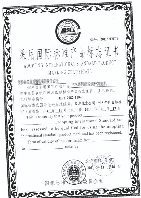 型號(hào): RZS系列產(chǎn)品質(zhì)量證書(shū);